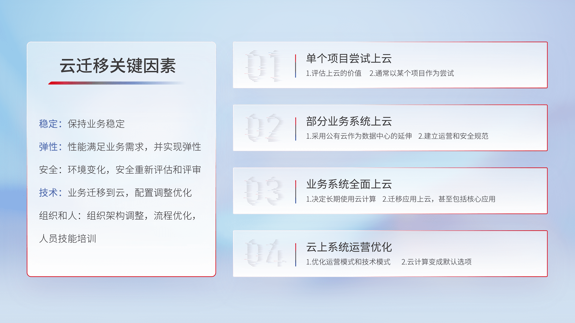 结合实际业务,,,,从规划设计、、云平台选型、、云原生改造、、、、数据迁移、、集成交付,,迁移全过程为客户识别最佳上云路径,,,,做好风险识别管理,,,设计网络架构、、、身份权限、、、、安全审计合规、、操作审计、、、日志审计、、、、监控告警策略、、、多站点容灾设计等,,,,对云上基础设施进行整体规划,,提升IT治理水平,,,,以满足弹性、、高可用、、、高性能的需求。。。。